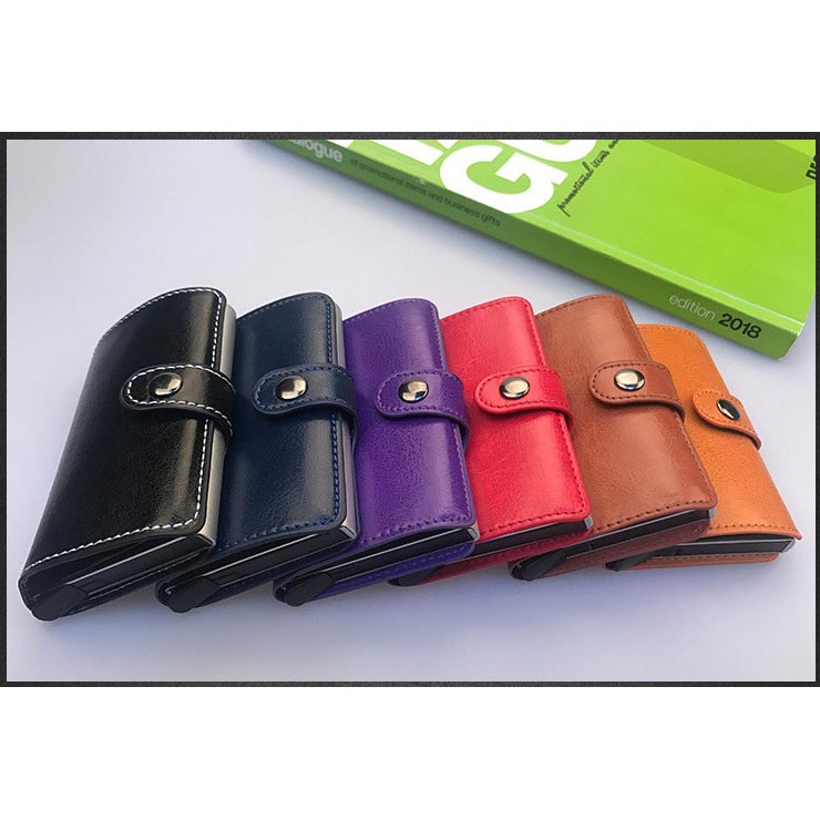 Iṣogo aṣa ati apẹrẹ tinrin tinrin, onimu kaadi yii n yọ didara ati ifọwọkan ifaya retro. Ifilelẹ iṣeṣe rẹ pẹlu apoti apoti irin ti a mu ṣiṣẹ nipasẹ bọtini itusilẹ, ti o lagbara lati gba awọn kaadi 5-6 ni ayika. Ni afikun, awọn apo meji laarin apamọwọ nfunni aaye fun awọn kaadi miiran bii awọn iwe-aṣẹ awakọ, awọn kaadi iṣeduro, lẹgbẹẹ yara owo kekere kan, pese iṣẹ ṣiṣe gbogbo-ni-ọkan fun awọn ohun pataki rẹ.